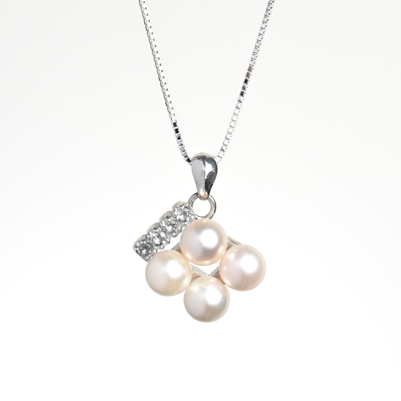 4粒の真珠をダイヤモンドフォルムに整列させ、ひと粒の天然石が胸元でそっと煌めくネックレス。
