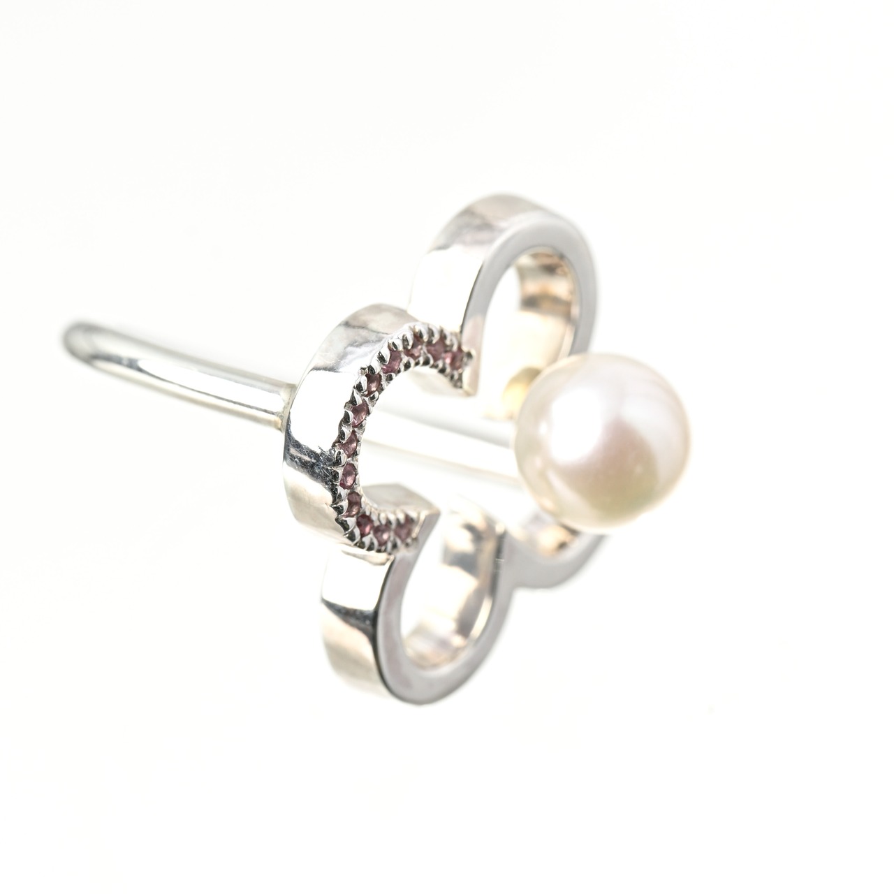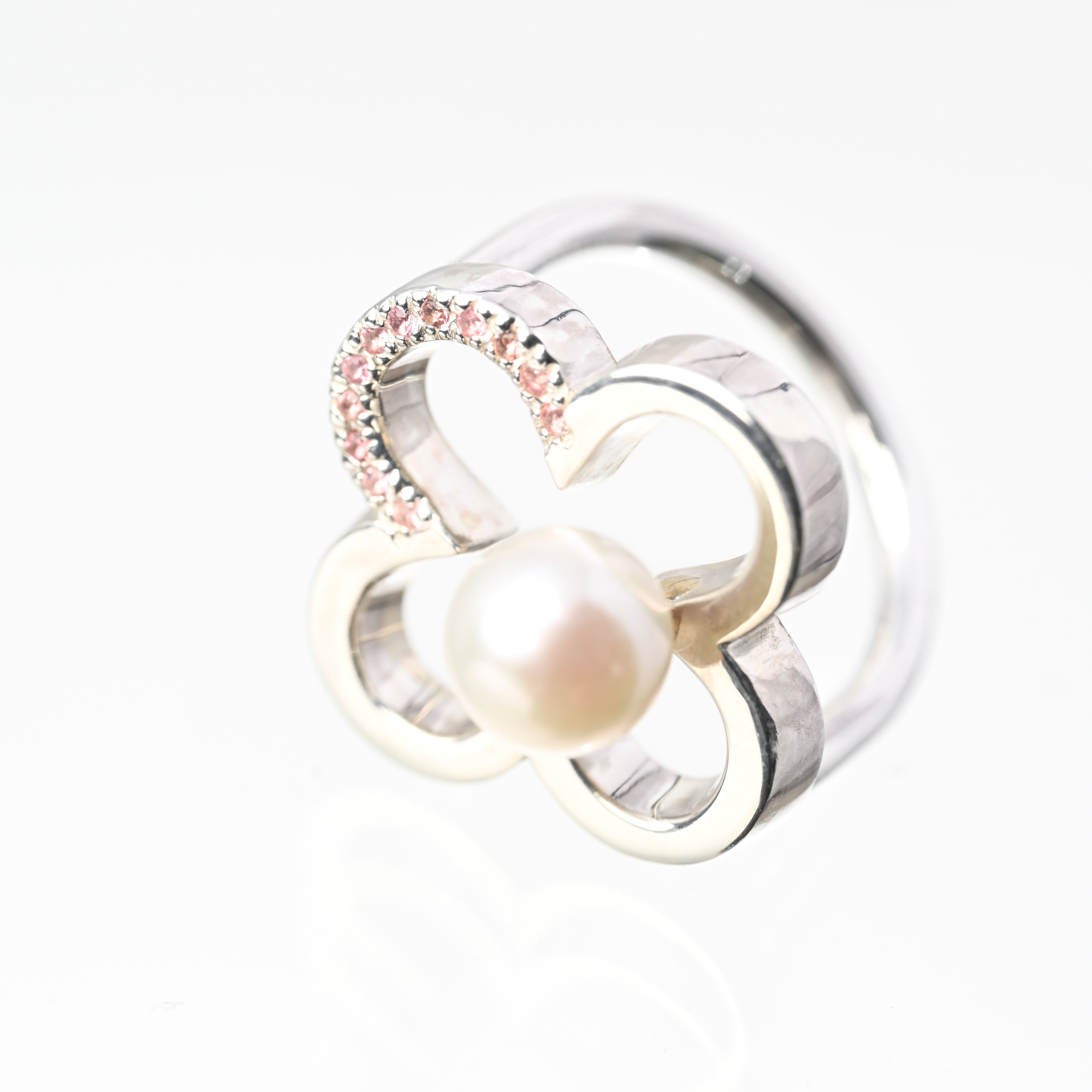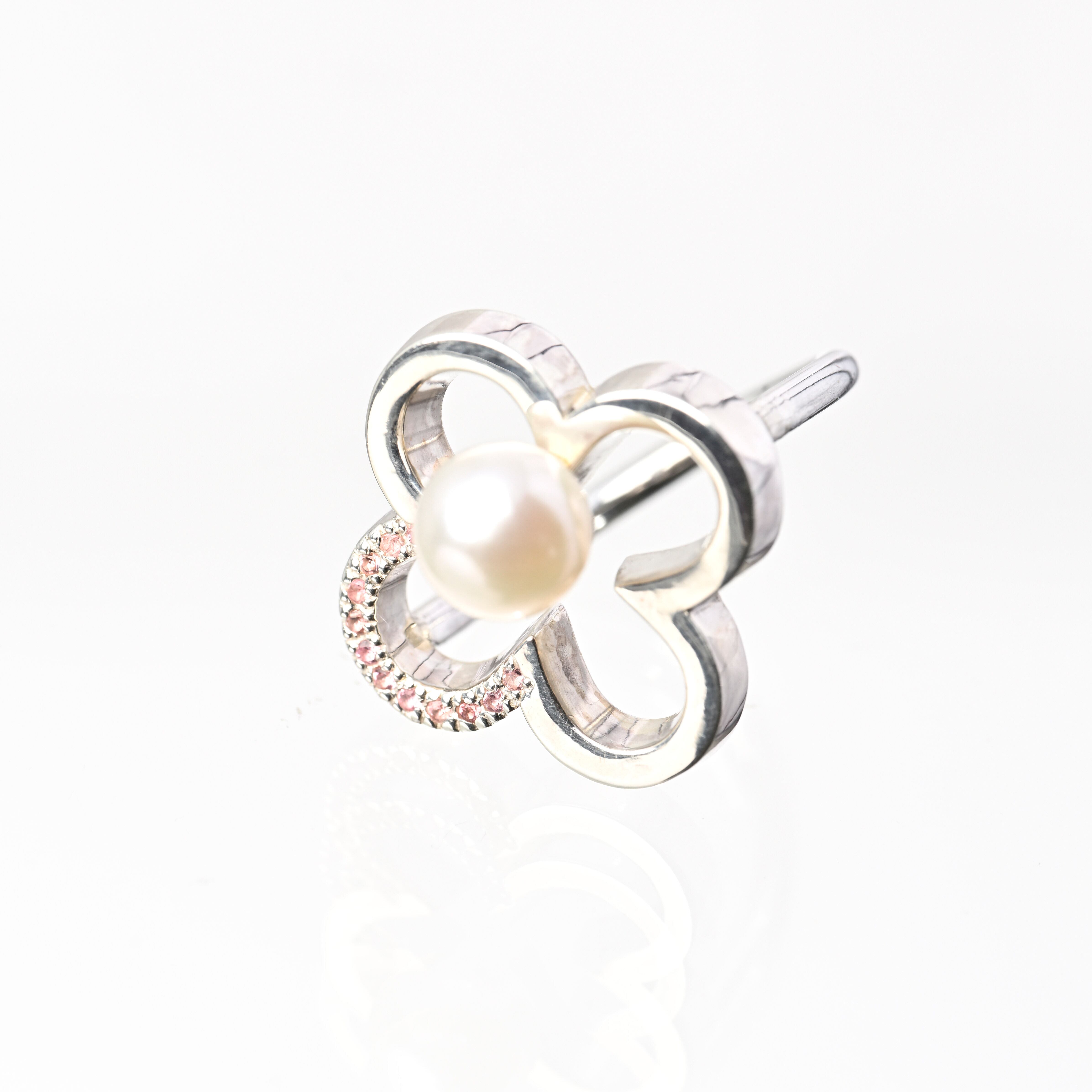 指先に幸運を宿すデザイン。クローバーに⼀粒のパールと天然⽯が彩りを添え、動くたびに上品