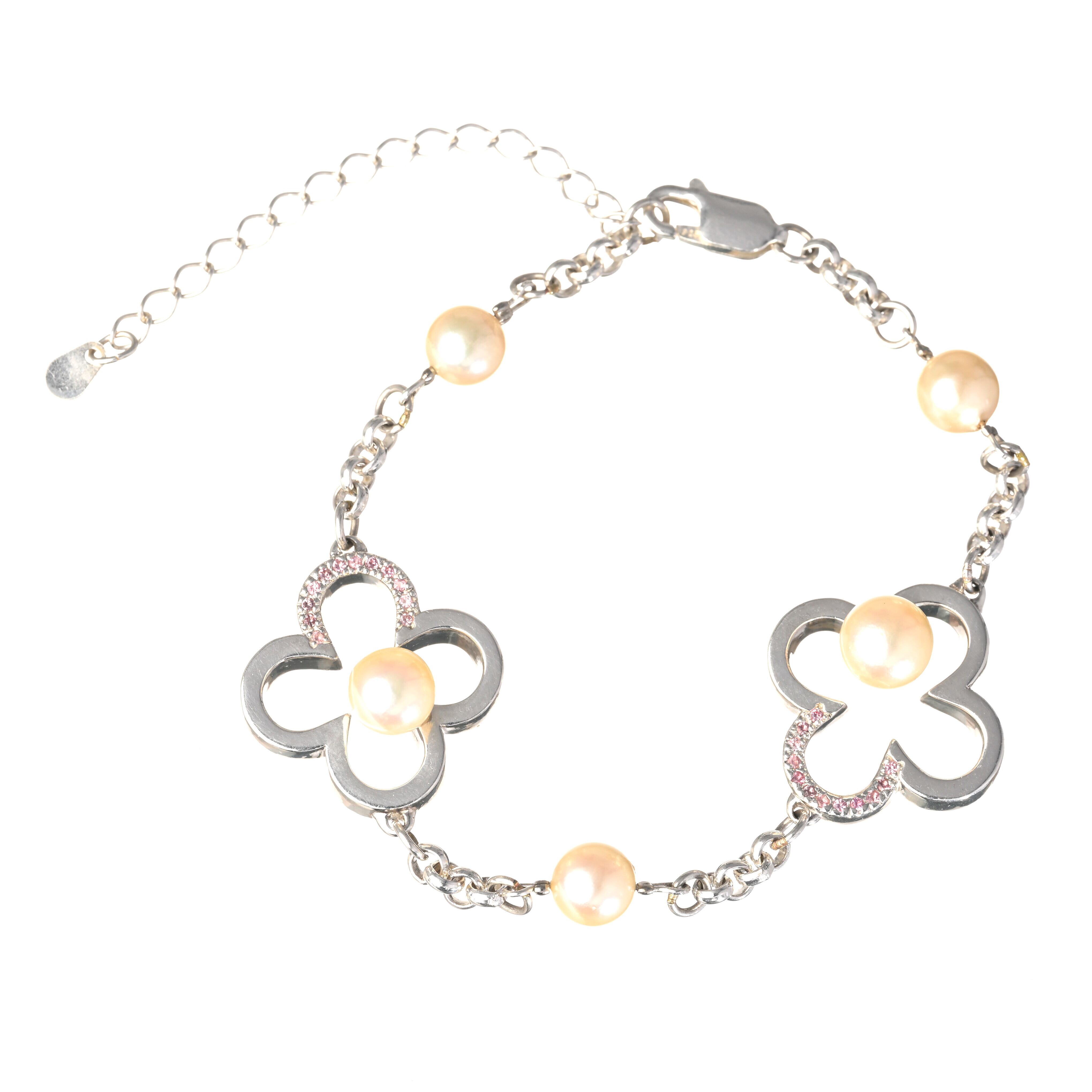 ⼿元で輝く幸運と調和。クローバー、 パール、 天然⽯の組み合わせが、動くたびに上品に光を反