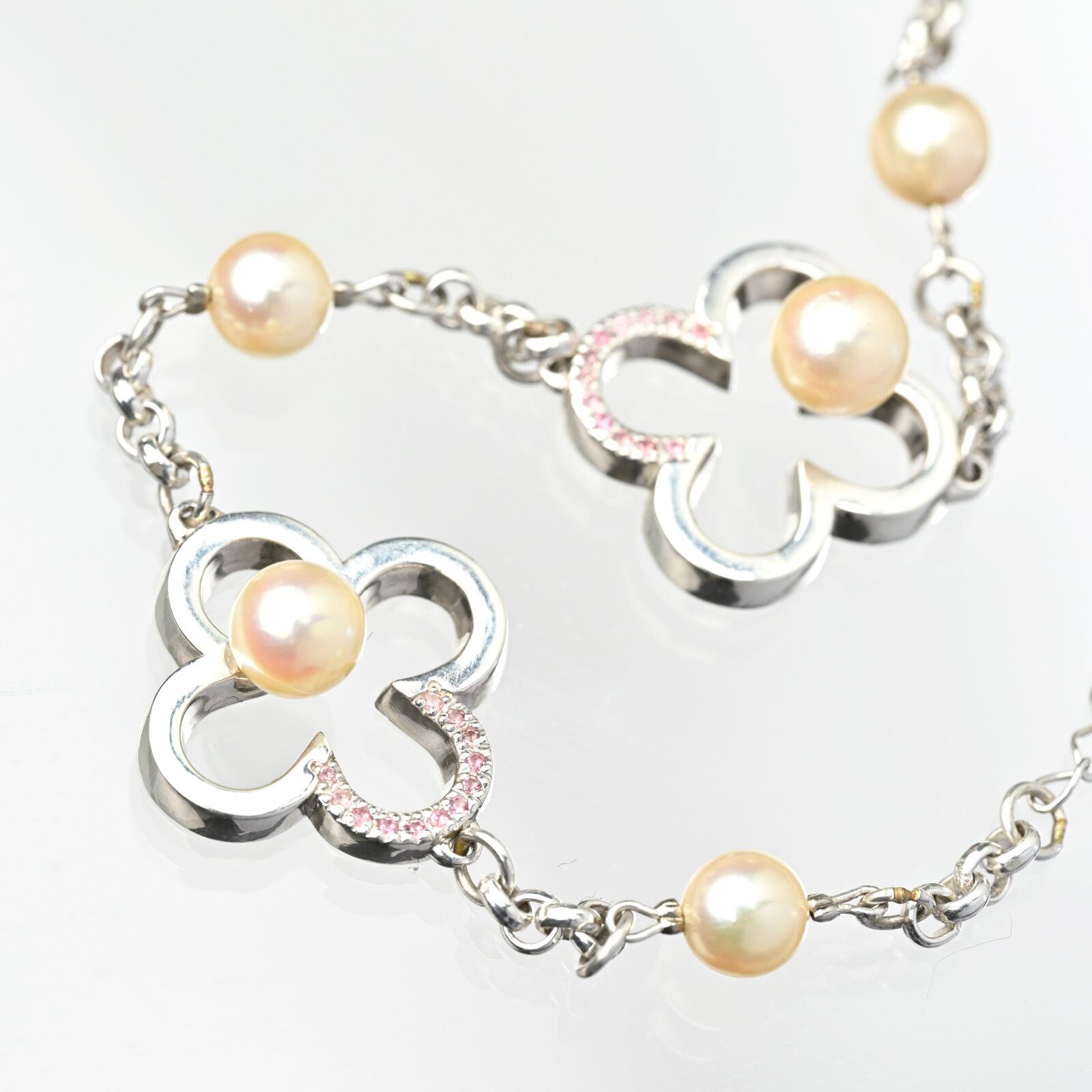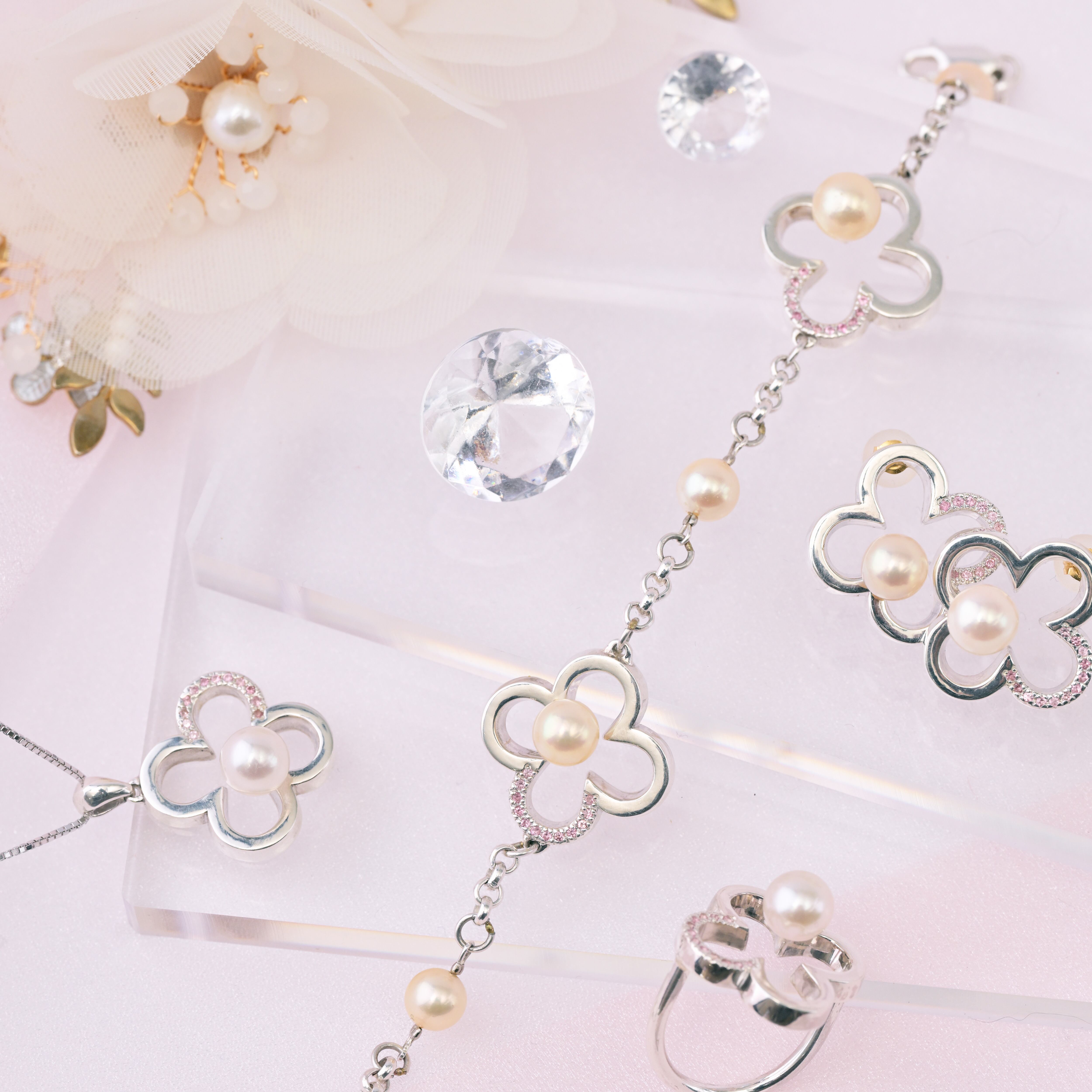 四葉のクローバーと天然⽯、パールの組み合わせで、⾝につける⼈に上品さと幸せ、個性をそっ