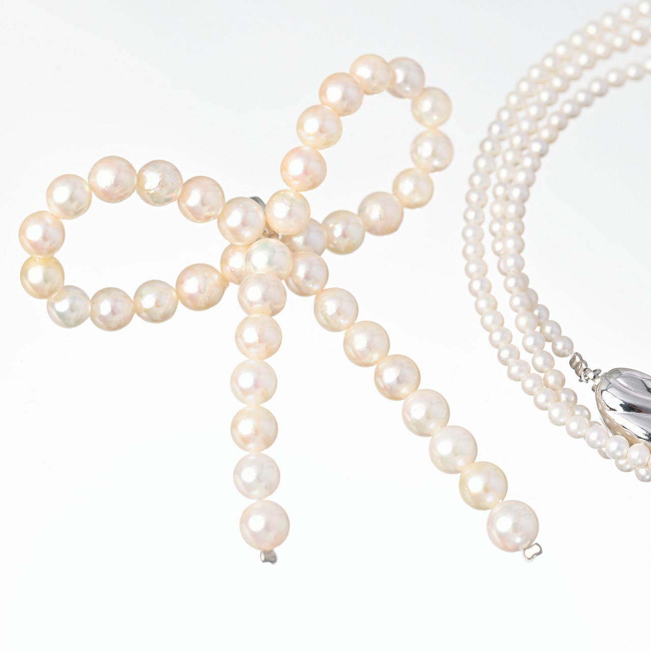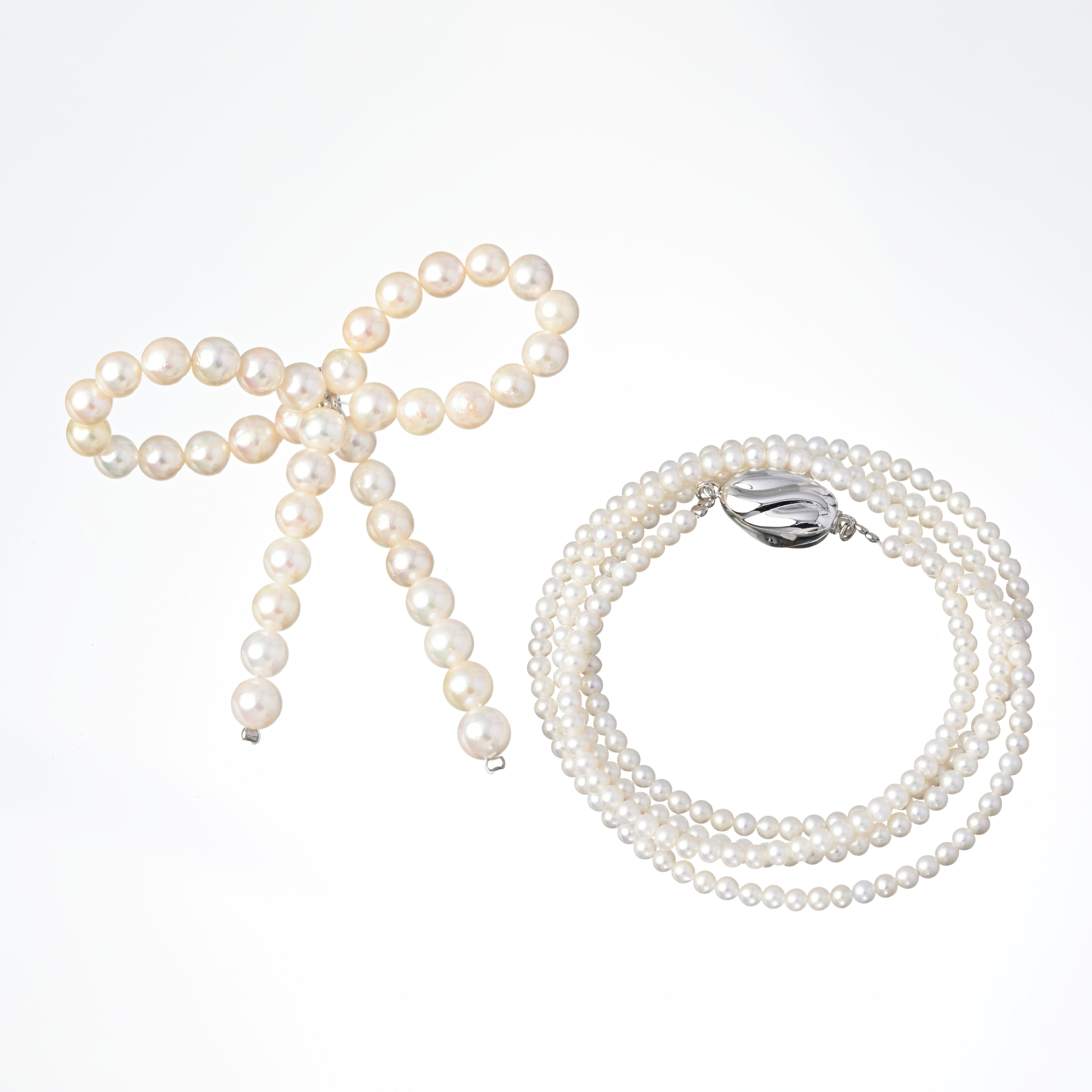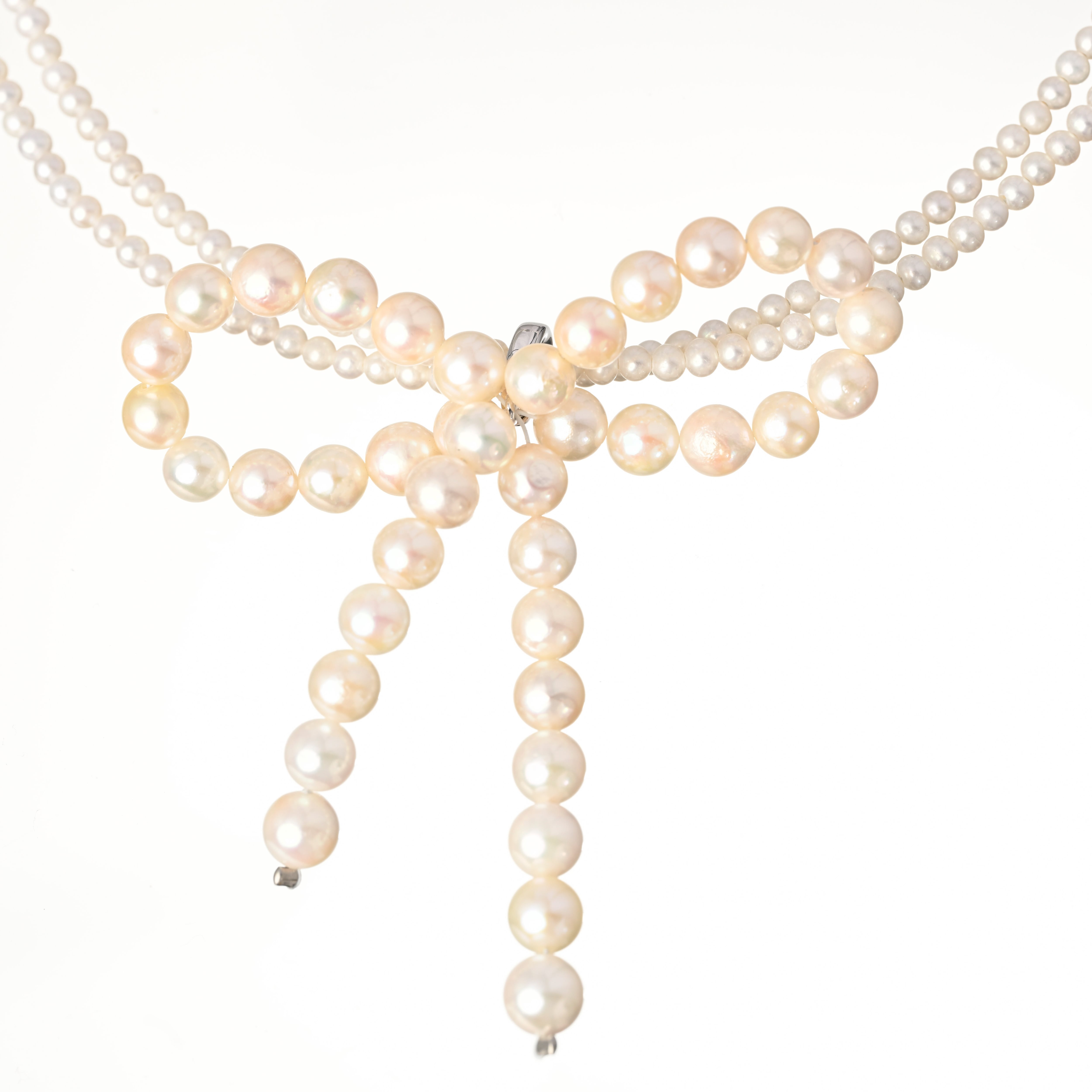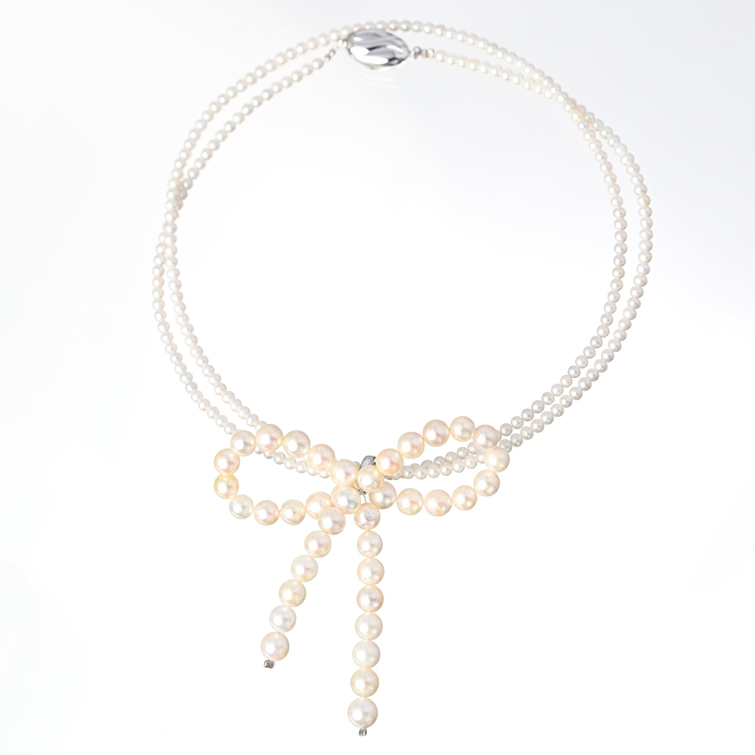 ベビーパールを二重にめぐらせ、胸元にあこや真珠のリボンを添えた、優雅なチョーカーデザイン。